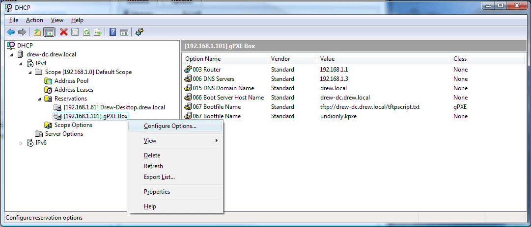 - Now, you can expand Reservations on the left side. Right click your client and click Configure Options.