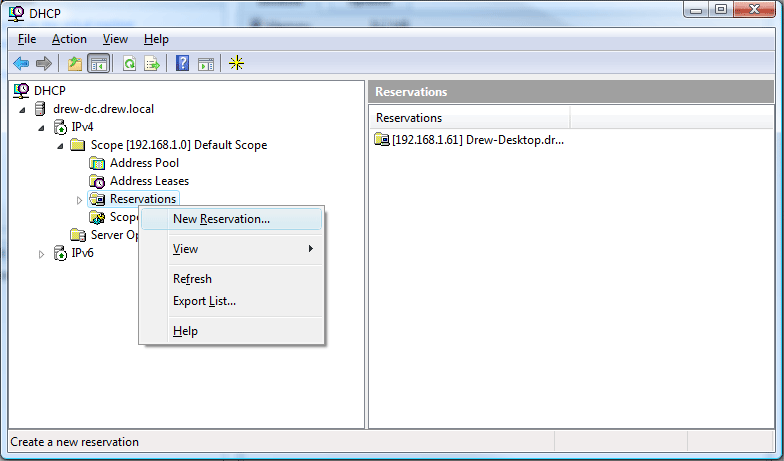 - Once you've done that, expand the server's name, then, if necessary, expand the protocol you're using (here we use IPv4) and expand the scope that corresponds to your network. Finally, right click Reservations in that scope, and click New Reservation.