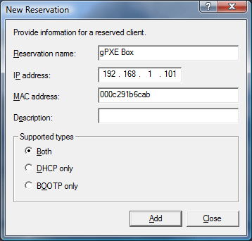 - In the New Reservation dialog box, give the client a friendly name, assign an IP address, then enter the MAC address of the NIC you'll be using for your PXE boot. When you're done, click Add down at the bottom of the dialog. If you have more than one client to add, you can do so in the same fashion, otherwise, click Close.