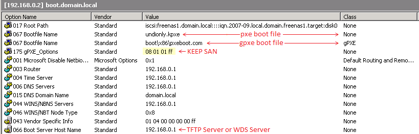 See gPXE Encapsulated options for information on Option 175, 08 01 01 FF is the Hex entry for keep-san 1